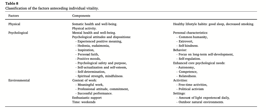 This research is included because it provides a scientifically grounded, multi-disciplinary framework for understanding vitality, which is directly linked to public well-being, somatic health, and mental flourishing. By synthesizing 93 studies, the paper establishes a unified description of vitality as a "positive subjective concept" that individuals can actively regulate and harness to improve their performance and quality of life. Furthermore, the research identifies actionable physical, psychological, and environmental antecedents—such as mindfulness, meaningful work, and exposure to nature—offering a practical roadmap for organizations and practitioners to deliberately promote healthiness and "spirit" in applied settings like workplaces and educational sectors.